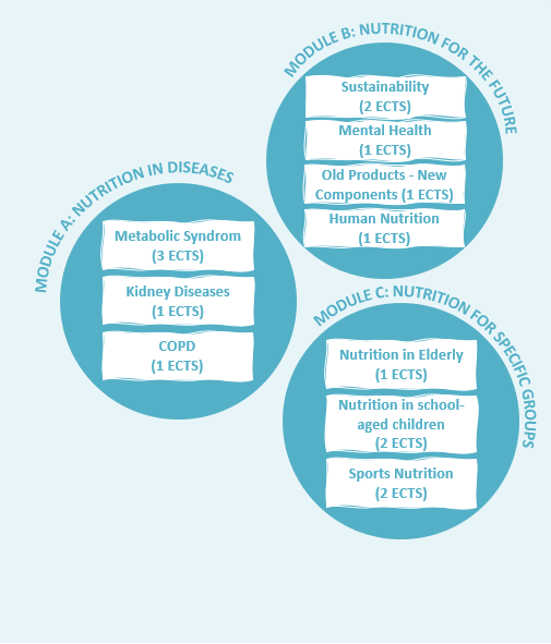Каждый модуль включает в себя 5 ECTS и состоит из небольших онлайн-курсов, которые могут быть предложены студентам отдельно в рамках онлайн- или смешанного обучения, в зависимости от потребностей университета. |
